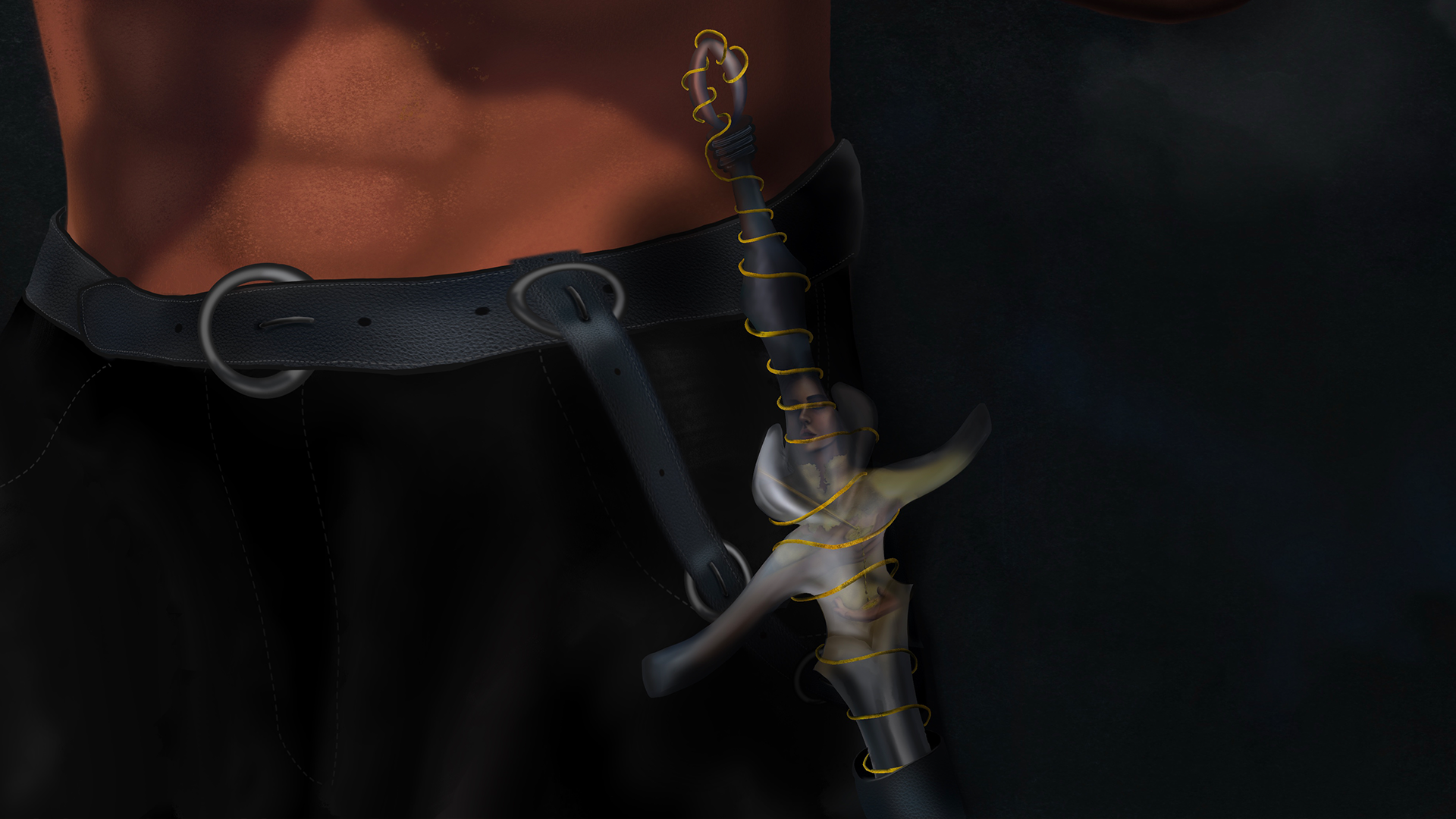 Also, his dagger is symbolic of a line in the book, “Brother, a knife cannot become a needle that mends you.” So I wanted the dagger to portray that eye of the needle at the top. Wait?! Did you see the second hidden detail in the dagger? Hint: Look for the reflection.